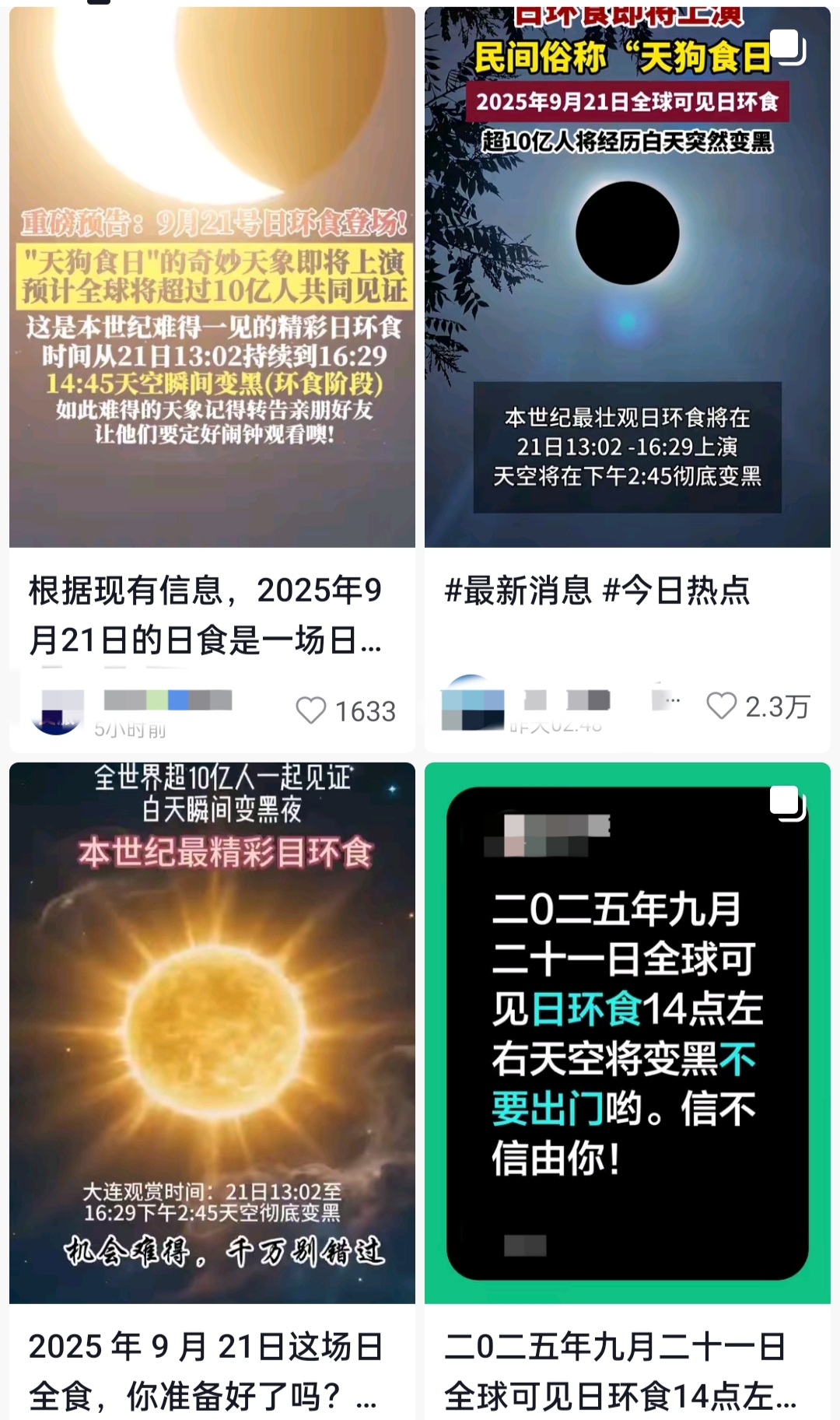 大皖新闻记者注意到,近期多个社交平台均出现相关消息,称2025年9月21日将出现日环食。其中,不少帖子和视频还使用了“本世纪最壮观”“本世纪最精彩”“全球超10亿人共同见证”“全球可见”等颇具吸引力的语句来形容此次日环食。甚至还明确提到出现时间为9月21日13:02至16:29,天空将在当天下午2:45彻底变黑。