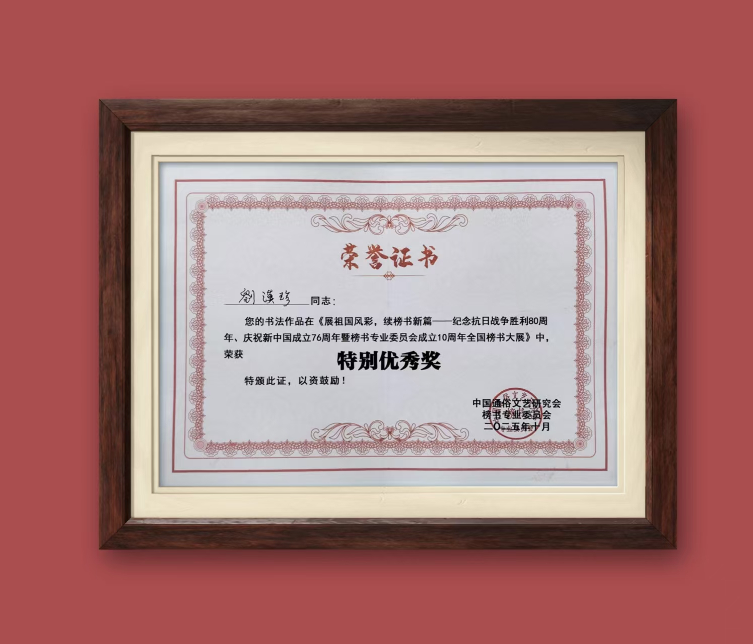 近日,在“展祖国风采,续榜书新篇--纪念抗日战争胜利80周年、庆祝新中国成立76周年暨榜书专业委员会成立10周年”全国榜书大展中,著名书法家刘汉珍凭借其精湛的榜书技艺和深厚的艺术造诣,从众多参展作品中脱颖而出,不仅荣获特别优秀奖,还获评优秀会员称号。