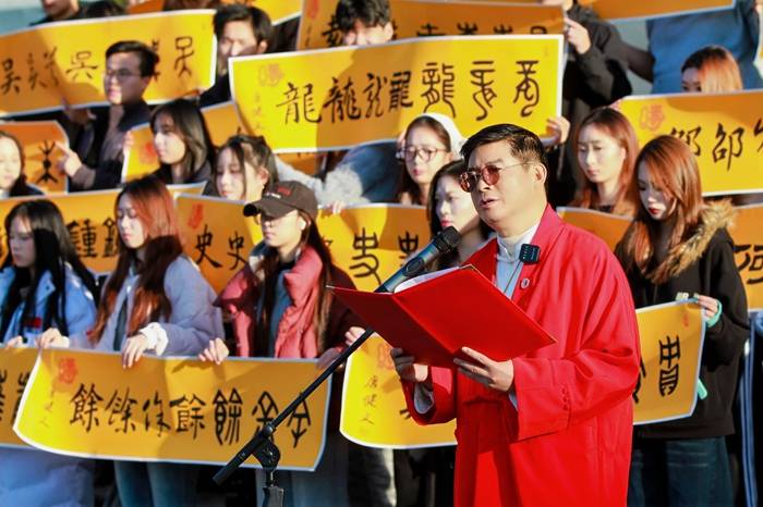 随后,一场震撼人心的视听盛宴在国际武术学院演武场上精彩上演。身为中国古文字博物馆的秘书长、国家一级美术师的唐健文在巨大的太极图上挥毫泼墨,与此同时,八卦图上100余名学生伴随着《大爱之缘》的悠扬乐曲,整齐划一地表演太极拳。一文一武,刚柔并济,书法艺术的静美与太极拳的灵动相映成趣,构成了一幅动人的文化画卷,将现场气氛推向高潮。