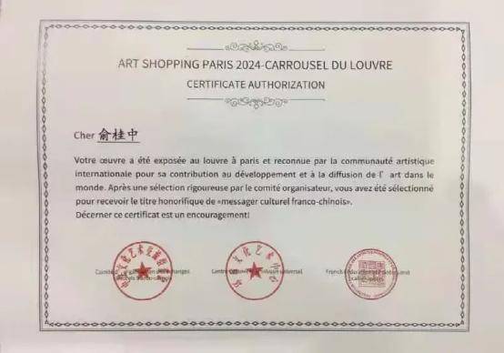 俞桂中老师2018年应邀参加中 央电视台书画筆会。先后荣获韩国、荷兰、意大利、美国四次美术作品展览金奖或特别金奖。作品《公鸡图》,《孔雀图》入选2024年法国卢浮宫国际艺术交流展。