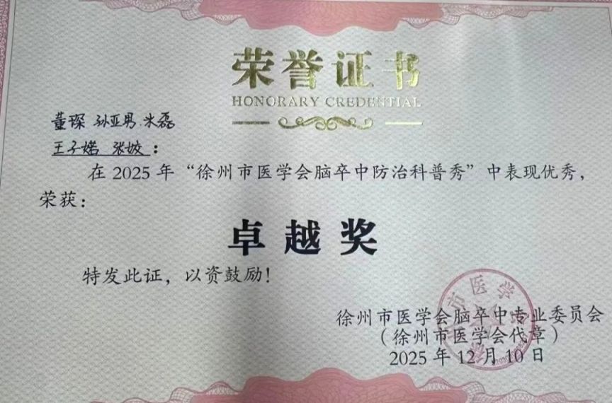 12月10日,徐州市医学会脑卒中专业委员会主办的脑卒中科普秀比赛传来喜讯——铜山区中医院张姣、孙亚男、董琛、米磊、王子婼医护团队,凭借作品《卒梦一场,脑卒中离你有多远》,从众多参赛队伍中脱颖而出,一举拿下卓越奖(特等奖)!