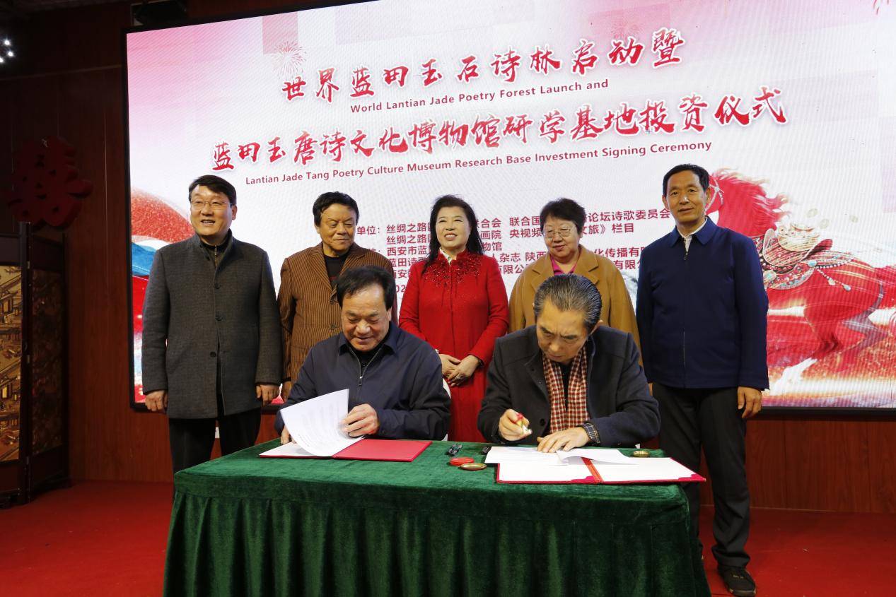 陕西华枫矩阵文化传播有限公司的马兴华副总经理与西安蓝田金鼎玉石艺园馆董事长瞿金续签定了“蓝田玉唐诗文化博物馆和研学基地”项目。