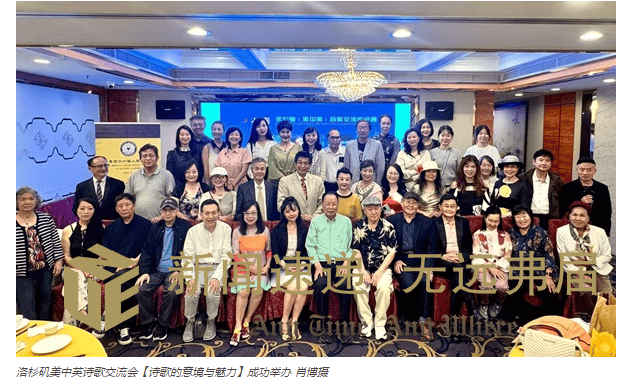 由「北美南加州写作协会」、「世界华文诗歌学会」、《美洲文化之声》共同举办的"洛杉矶美中英诗歌交流会「诗歌的意境与魅力」"于9月20日在洛杉矶柔斯密隆重举办。活动现场嘉宾云集,气氛热烈。本次活动特邀诗人韩舸友与来自英国的诗人廖锡娟为主讲嘉宾,叶如钢和刘荣文两位教授担任对话嘉宾。这场跨越美洲、英国与中国的文学盛会,不仅是一场诗歌的交流与分享,更是一次文化的交汇与文明的对话。